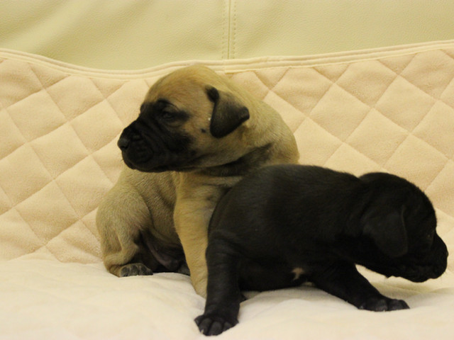 グレートデンのフォーンとブラックの赤ちゃん今日で、20日目です。男の子兄弟で、あっちむいて・ホイしてるみたいに見えますね。だいぶ顔立ち、毛並みもハッキリになり益々の成長が楽しみです。 -