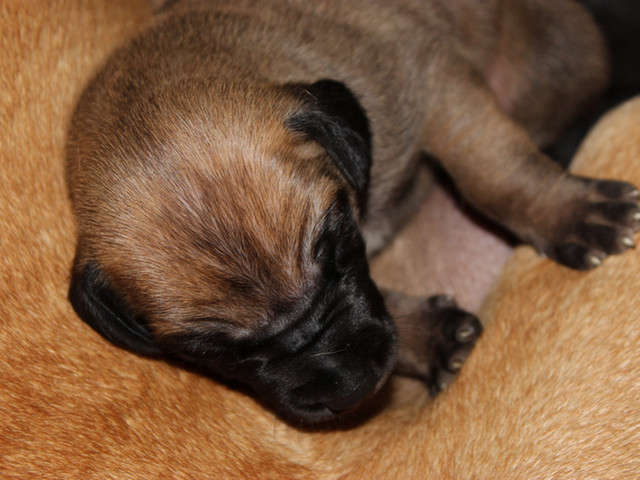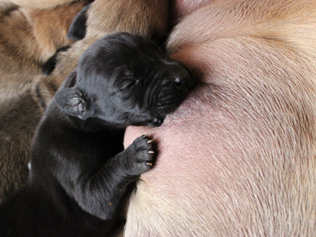 グレートデンのチャチャちゃんです。今日も、一生懸命にお母さんのおっぱいを見つけてます。だいぶ、赤ちゃんの黒い毛も抜けて綺麗なフォーンになってきてます。目の方も、だいぶ開いてきました。楽しみです! -
