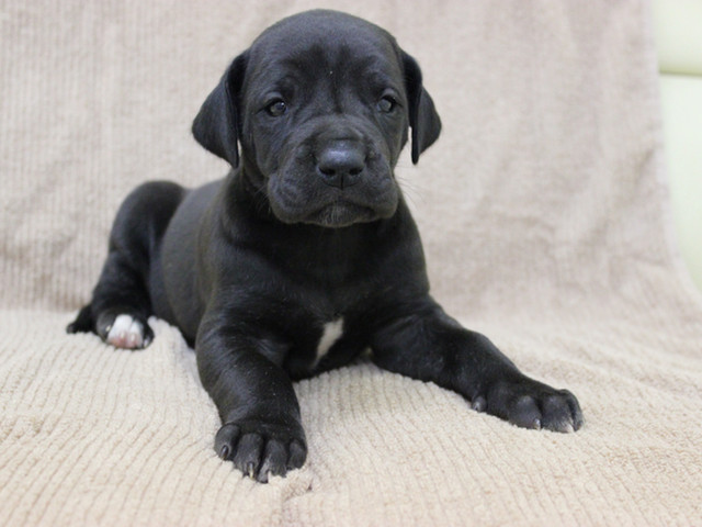 グレートデンの赤ちゃん、みんな目が開きました。とっても可愛いですよ。顔立ちも、だいぶハッキリなり赤ちゃんの時の黒毛も抜けてきて綺麗な毛並みになって来ました。毎日の成長が楽しみです! -